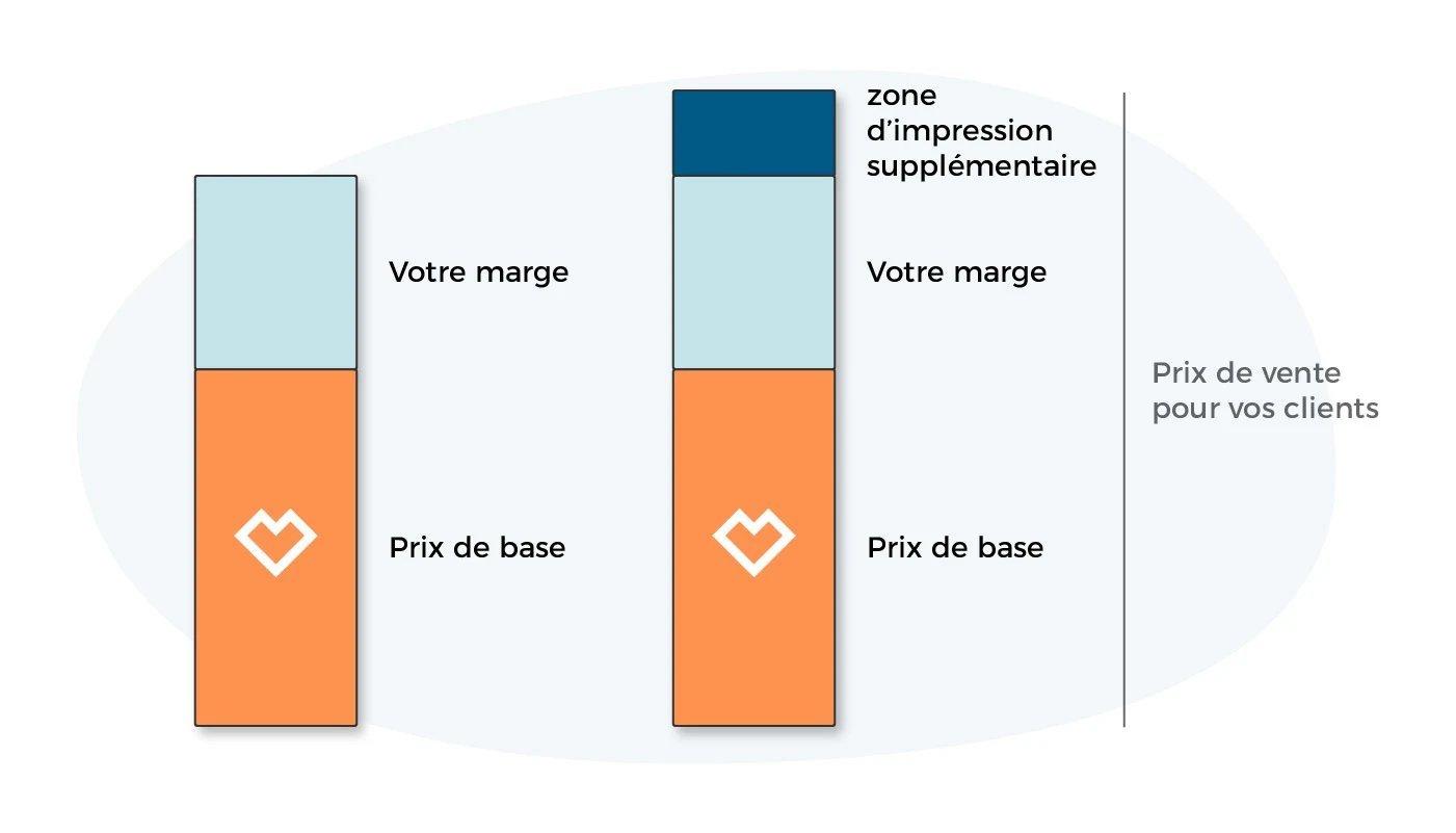 Si vos clients ou vous ajoutez d’autres zones d’impression, le prix de vente augmentera de 4,50 € / CHF 5,00 (à partir du 1er août 2023 6,00 € / CHF 6,00) par zone d’impression supplémentaire. Ces coûts supplémentaires s’ajoutent simplement au prix de vente et n’ont aucune influence sur le montant de votre rétribution. Votre marge reste inchangée.